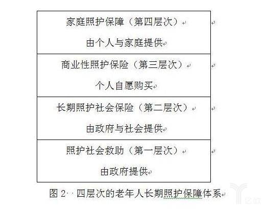 社區(qū)居家養(yǎng)老服務體系建設的核心之一就是為老年人建立一個長期照護保障體系。通過外國比較及對我國實際情況的研究,未來我國老年人長期照護保障體系的基本框架應該是由四個層次構成(見圖2)。
